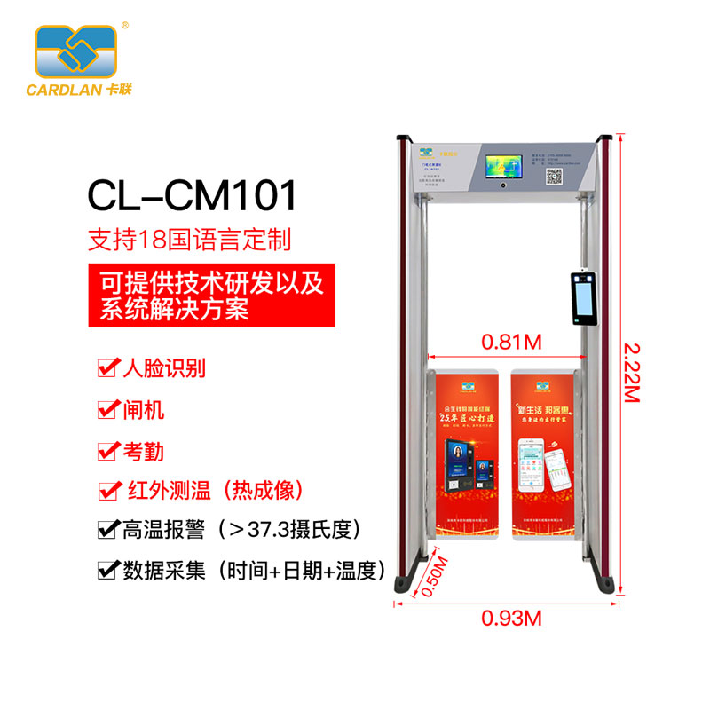 卡聯(lián)人臉識別測溫安檢門是一種精確、便利的測試人體體溫的檢測設(shè)備。當(dāng)人從安檢通道走過時,如果人的身體溫度超過事先設(shè)定的溫度, 系統(tǒng)就會自動報警。如果體溫正常,則顯示正常體溫值,并將體溫實時顯示在屏幕上。本產(chǎn)品使用方便、簡單,可以被安裝在學(xué)校、幼兒園、車站機場、地鐵出入口、商場超市、工礦企業(yè),各類展會等人流量大的公共場所。而且移動方便靈活,精確度高,可以測量顯示 30℃-50℃, 使得它不僅對感染病毒導(dǎo)致體溫升高人士作出檢測報警,同時也被用來作為快速的體溫測量設(shè)備。