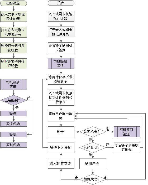 嵌入式刷卡機通過RS232串中與計價器對接,獲取相應的消費數(shù)據(jù)。通過出租車嵌入式刷卡機與計價器的無線數(shù)據(jù)交換后,在出租車嵌入式刷卡機刷用戶卡實現(xiàn)收費。在進行CL-E0109嵌入式刷卡機的刷卡扣費等操作前,必須首先刷司機卡的簽到。