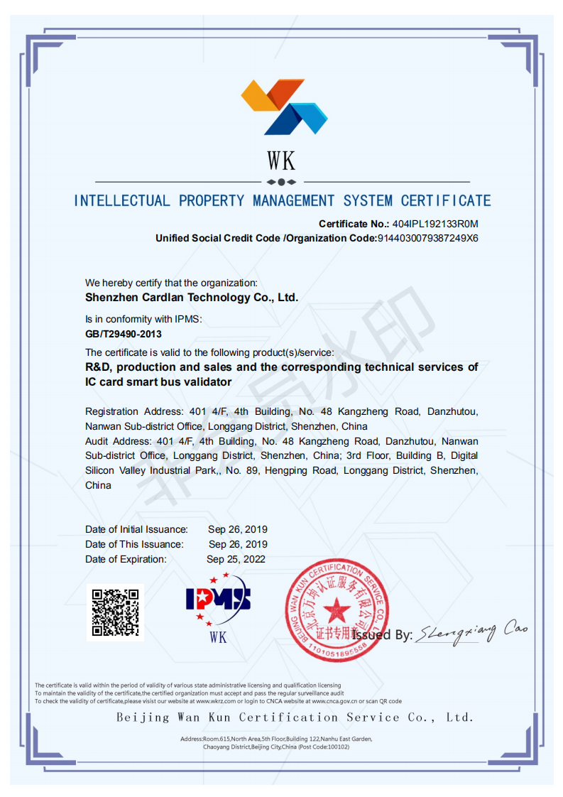 通過(guò)制度建設(shè)、全員參與、穩(wěn)健推進(jìn)、逐步落實(shí),2019年9月26日,深圳市卡聯(lián)科技股份有限公司正式通過(guò)北京萬(wàn)坤認(rèn)證服務(wù)有限公司的外審認(rèn)證,獲得知識(shí)產(chǎn)權(quán)管理體系認(rèn)證證書(shū)。該認(rèn)證的通過(guò),彰顯了深圳市卡聯(lián)科技股份有限公司對(duì)于知識(shí)產(chǎn)權(quán)重視和全面升級(jí),標(biāo)志著企業(yè)知識(shí)產(chǎn)權(quán)管理進(jìn)入全新階段。